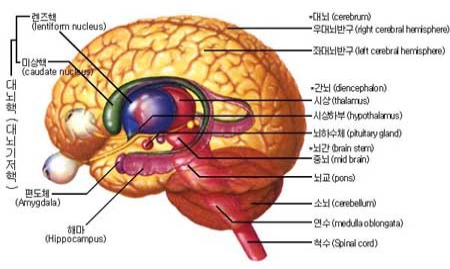 기저핵, 간뇌 등으로 구성 있는데,